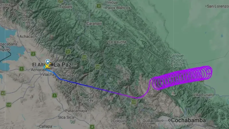 El portal Flightradar24.com, que expone en tiempo real los recorridos, da cuenta que la aeronave comenzó a registrar un vuelo circular cuando ingresó a espacio aéreo de Cochabamba.